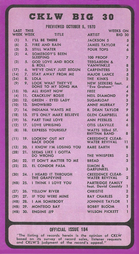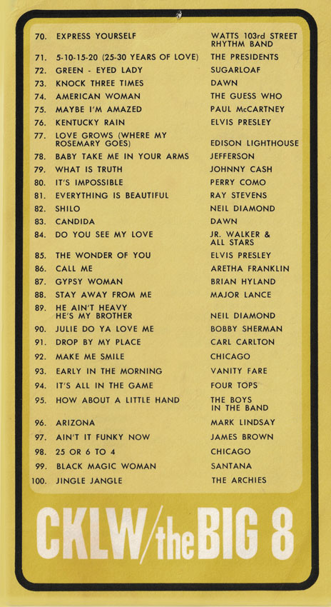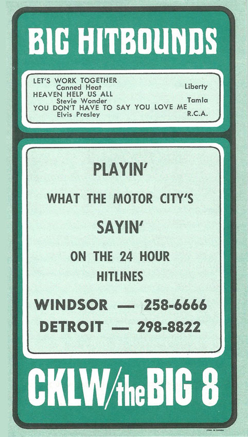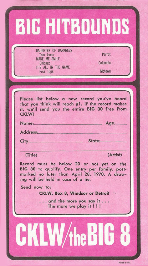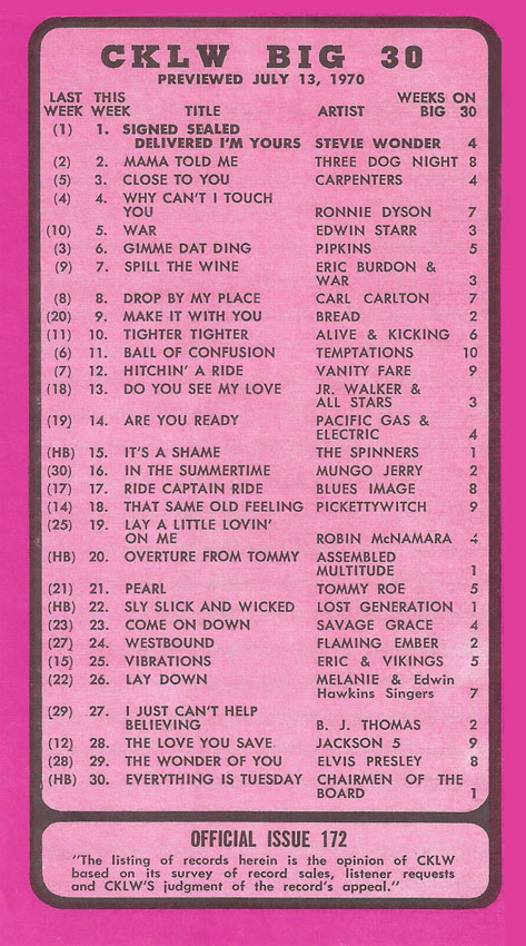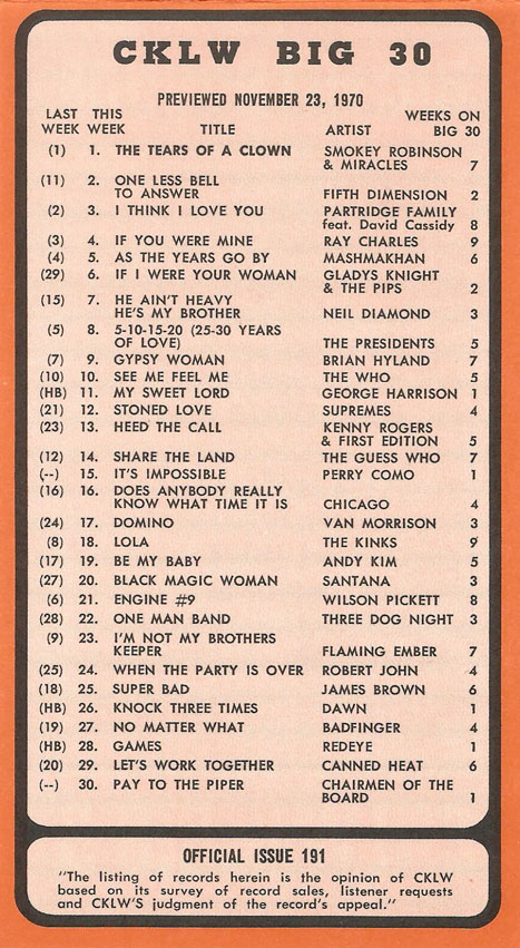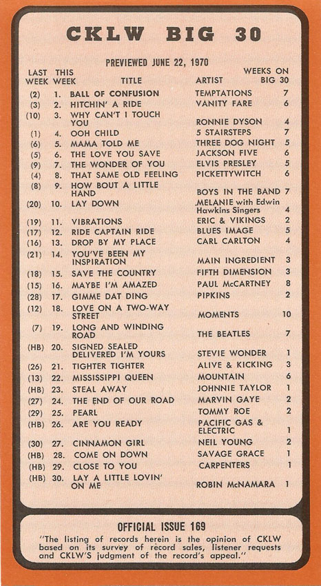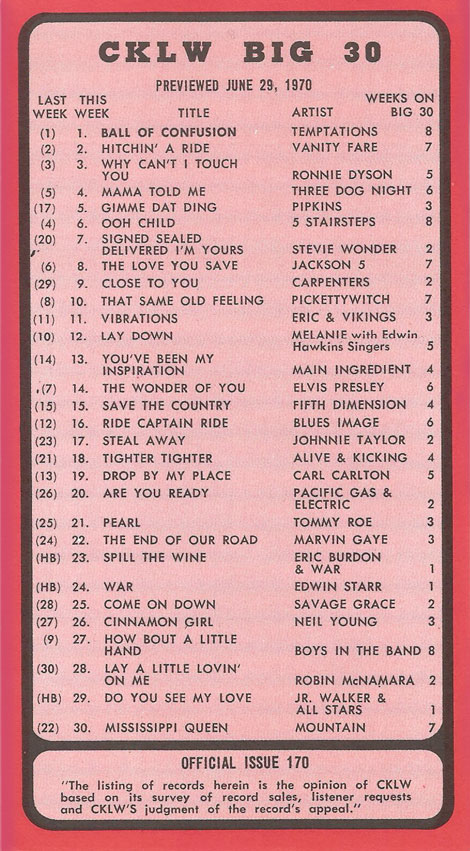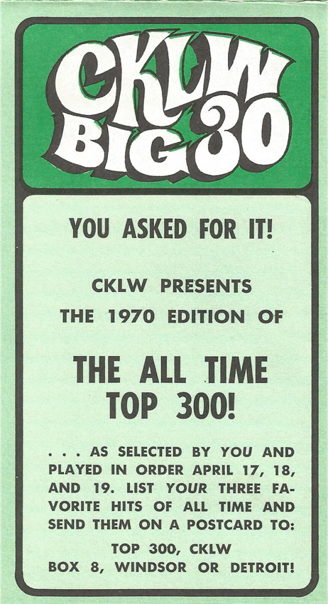 The Motor City Big 30 Chart is an important historical document in the Drake Radio BOSS Format. Every week from 1967 through the late 70's the weekly CKLW Big 30 chart was released and gathered up by music fans everywhere in The Motor City at local record stores. Collectors still covet original copies and many are still traded and sold on ebay and the like. Here's our collection - we'll add to it as we get more. Check in on the Facebook group for new posts daily or photos and audio.