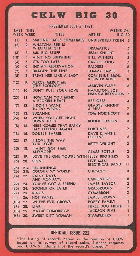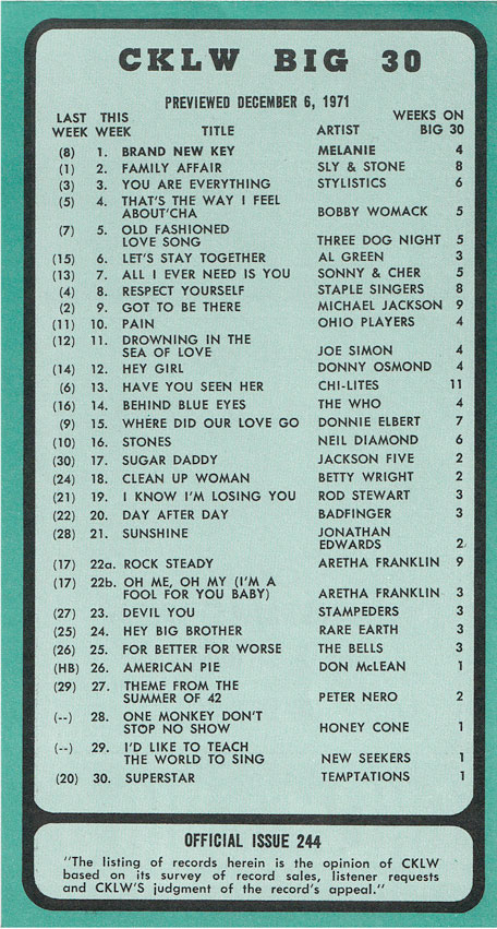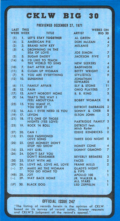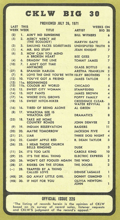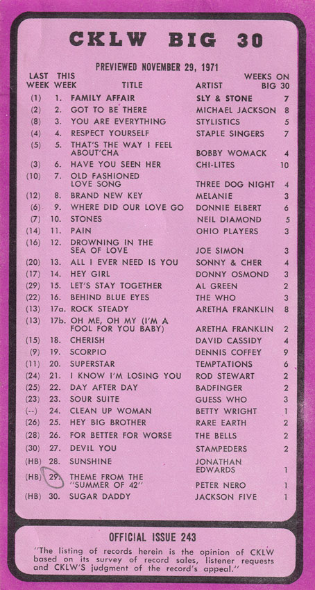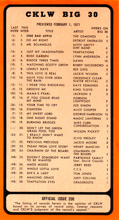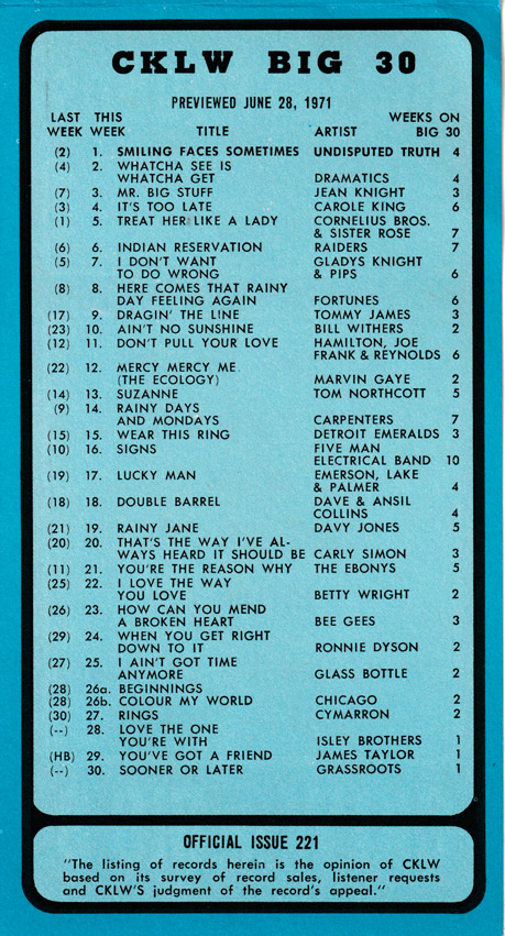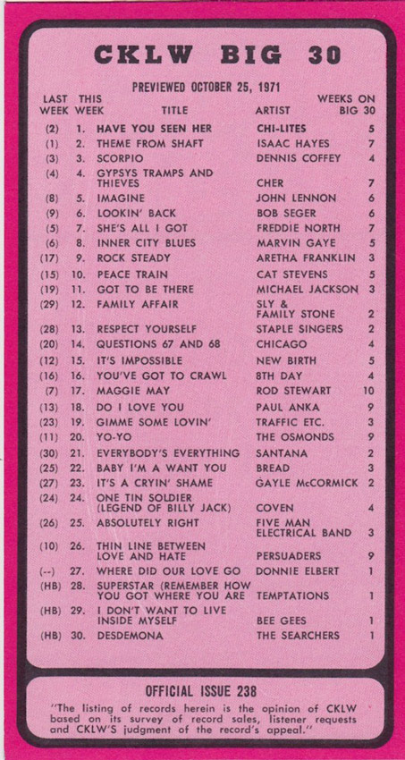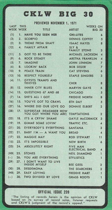 The Motor City Big 30 Chart is an important historical document in the Drake Radio BOSS Format. Every week from 1967 through the late 70's the weekly CKLW Big 30 chart was released and gathered up by music fans everywhere in The Motor City at local record stores. Collectors still covet original copies and many are still traded and sold on ebay and the like. Here's our collection - we'll add to it as we get more. Check in on the Facebook group for new posts daily or photos and audio.