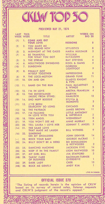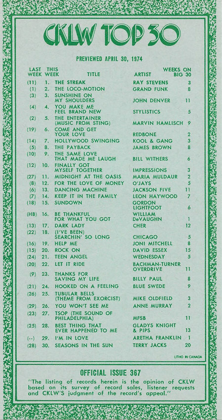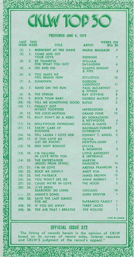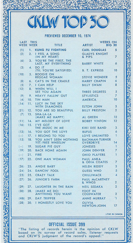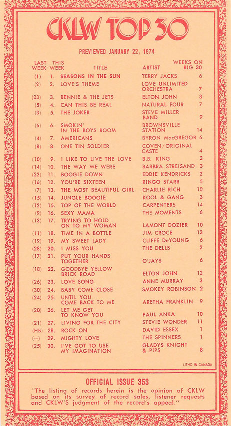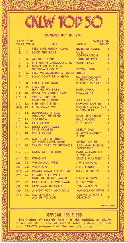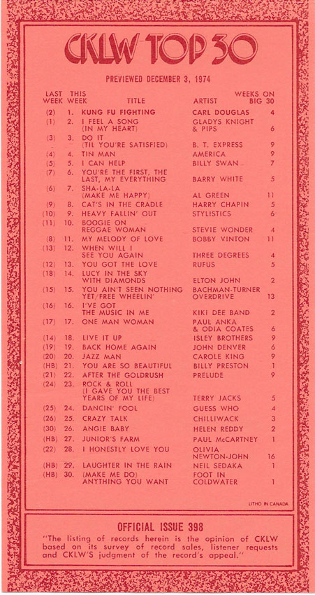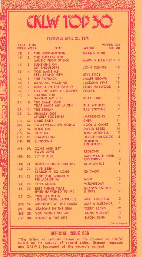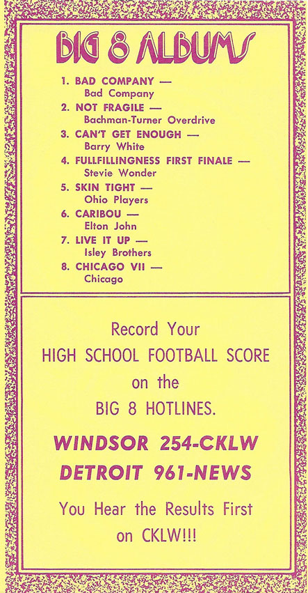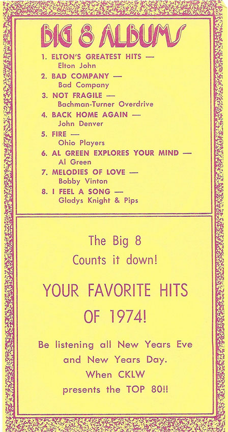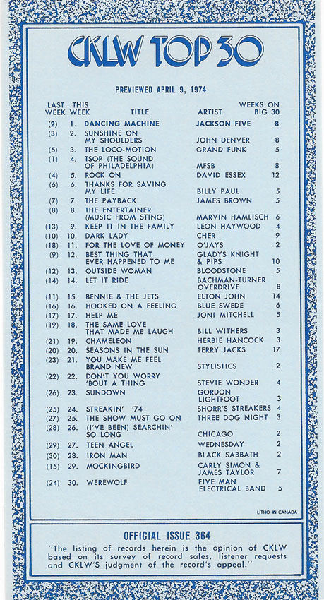 1974 CKLW Charts (Back To Charts HOME)